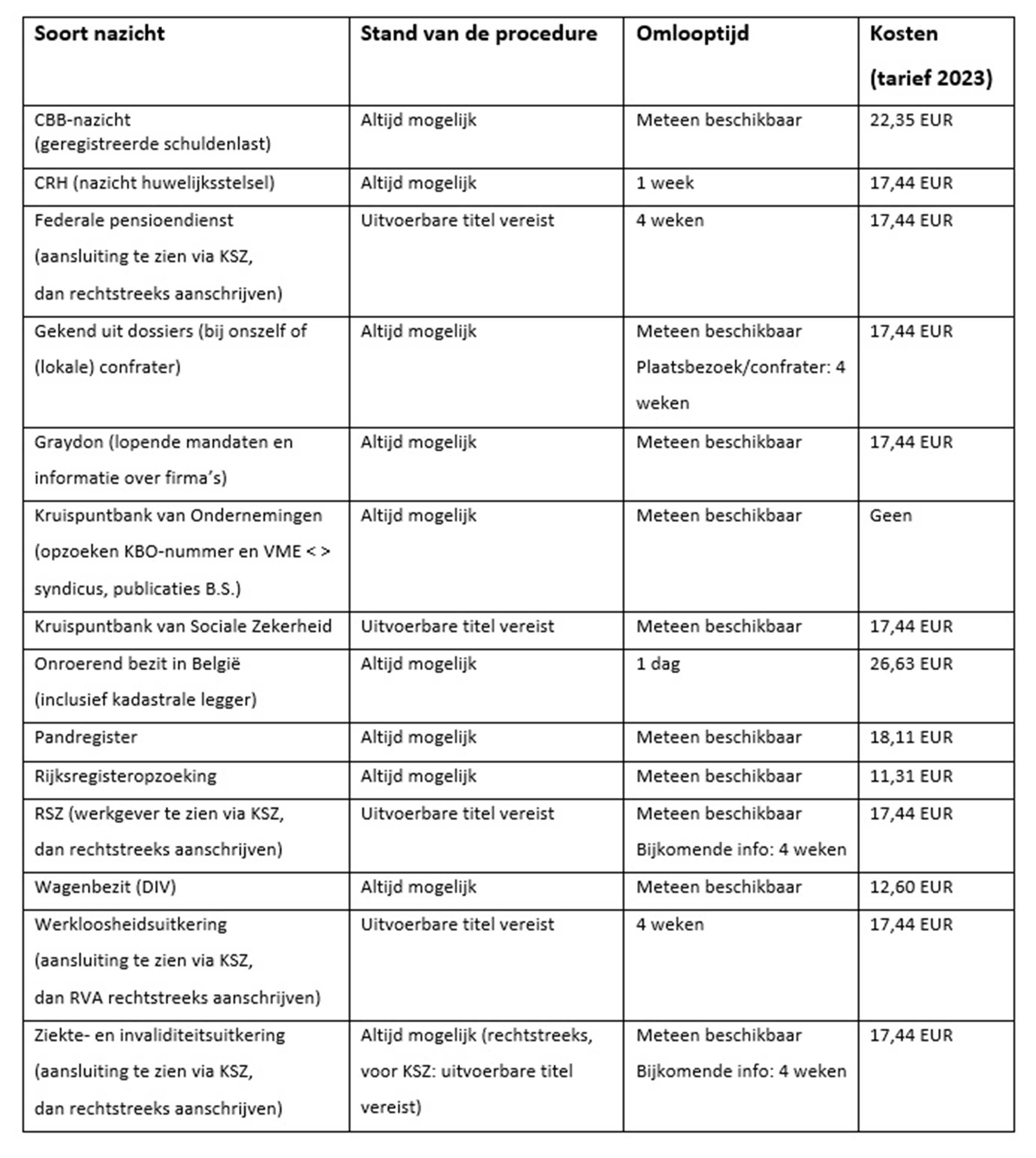 Hieronder vindt u het handig alfabetisch overzicht van de verschillende informatiekanalen, in welke stand van de procedure wij deze voor u kunnen nakijken, de wachttijd en de kostprijs.